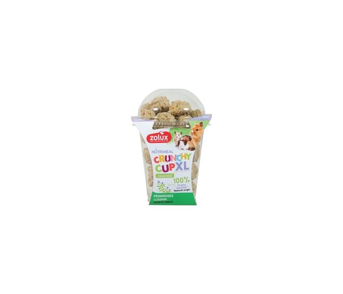 De Zolux NMeal Crunchy Cup XL Natuurlijk is een voedzame en natuurlijke snack voor knaagdieren. Deze gezonde traktatie in XL-formaat zit boordevol vezelrijke luzerne (30%) en bestaat volledig uit 100% natuurlijke ingrediënten, zonder toegevoegde kleurstoffen of suikers. De combinatie van luzerne, maïs, sojahuls en wortel zorgt voor een gevarieerde smaakbeleving.